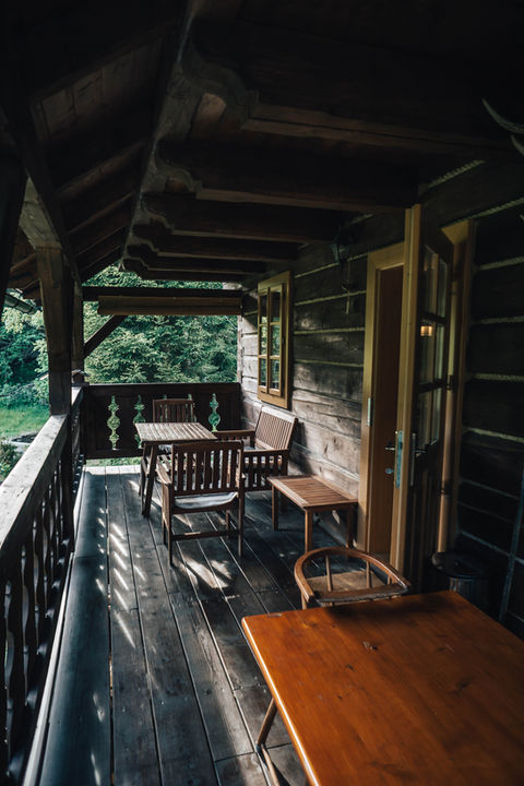 V přízemí roubenky je předsíň s botníkem, z které se vchází do společenské místnosti s kachlovými kamny, které vytápí celý objekt, plně vybavená kuchyň (elektrický sporák s troubou, myčka, rychlovarná konvice, mikrovlnka, kávovar Nespresso, toustovač, topinkovač, veškeré nádobí), velký jídelní stůl a dvoulůžko k odpočinku, TV, DVD, rádio s gramofonem. Ze společenské místnosti je přístup na velkou terasu, na které je posezení a výhled na protější lyžařský svah.